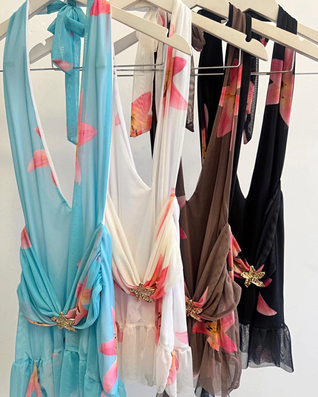 Descubrí el Vestido Astro, confeccionado en tull estampado con delicados motivos floreados y una sofisticada hebilla en forma de estrella que aporta un detalle único.