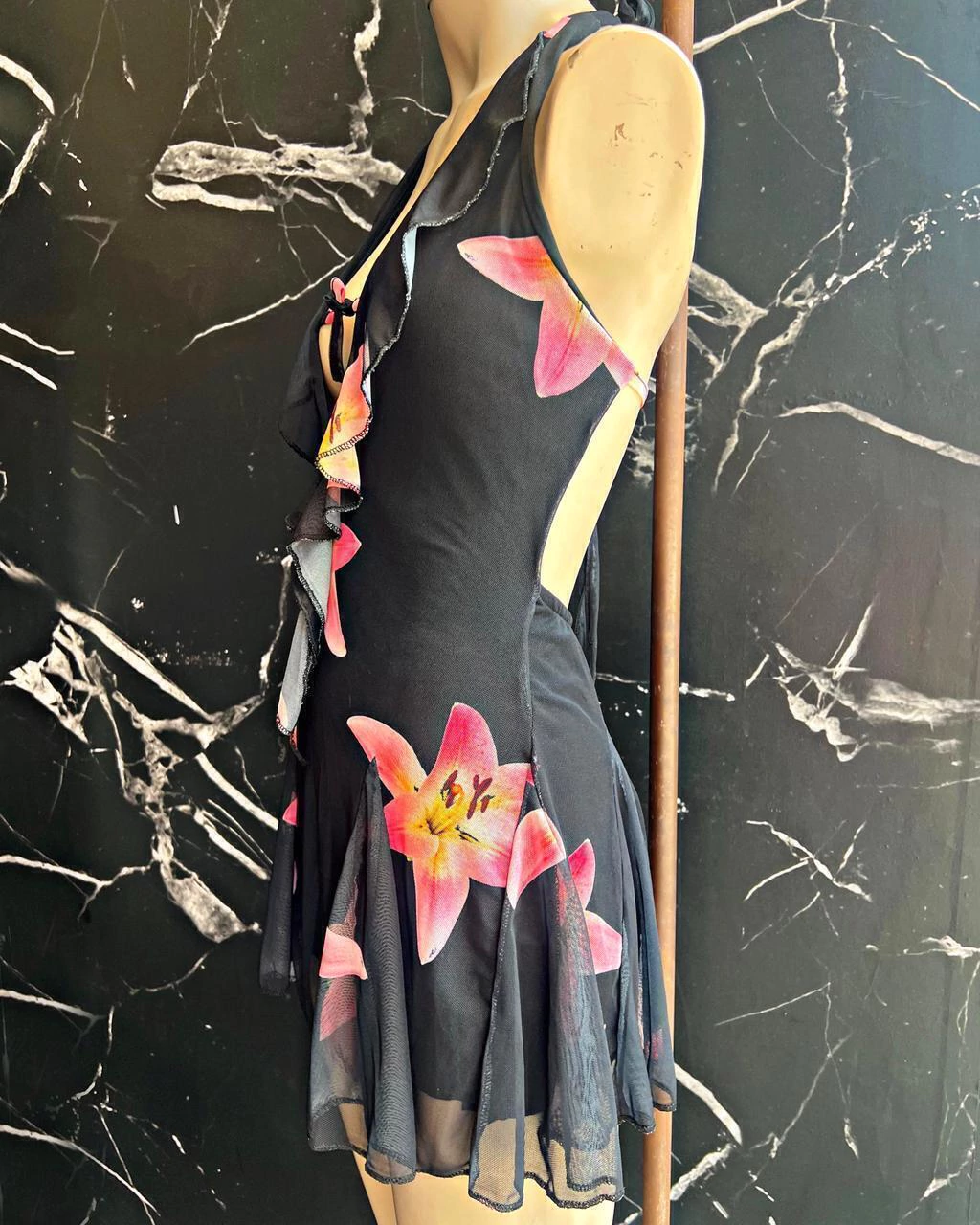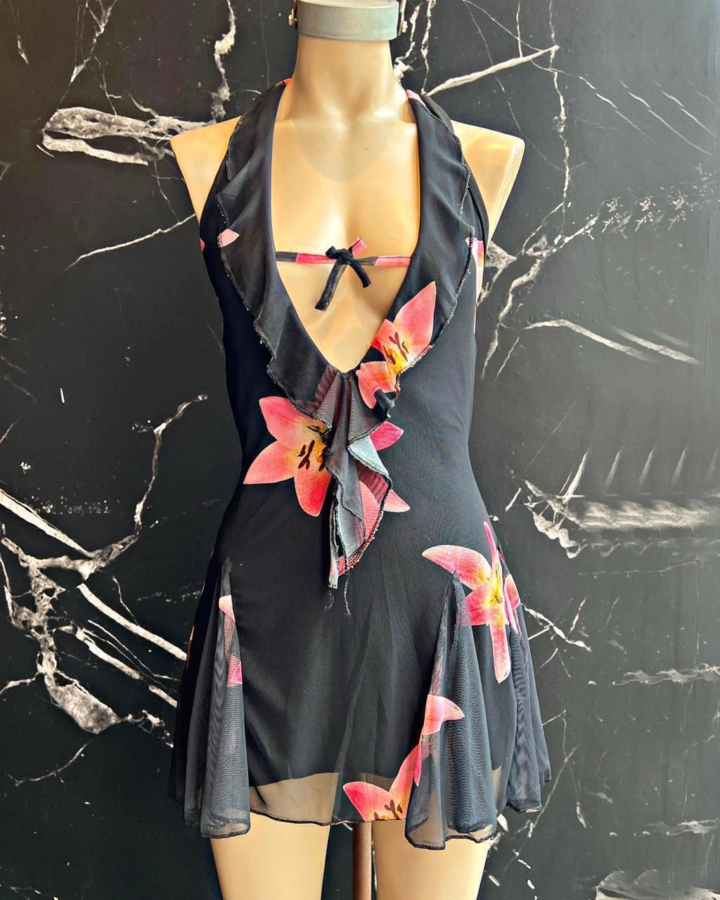 Vestido Flow: elegancia y frescura en cada detalle. Confeccionado en tull estampado, presenta delicados volados y un escote que realza la figura.